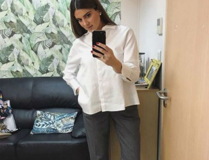 Η μέλλουσα μανούλα επέλεξε να φορέσει ένα λευκό πουκάμισο κι ένα γκρι παντελόνι...